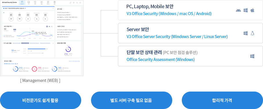 악성코드, 해킹 차단 등 다양한 보안 위협 예방 및 사내 디바이스의 보안 상태를 쉽게 관리 할 수 있는 SaaS 매니지먼트를 제공합니다.